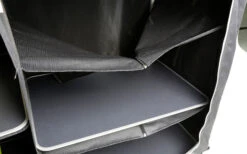 Ein vormontiertes Rahmengestänge aus Aluminium, auf das ein hochwertiger Bezug aus widerstandsfähigem Polyester aufgezogen wird, bildet das Gerüst für die in Anthrazit gehaltenen Schränke. Die abriebfesten, aus Ripstop Polyester gefertigten Gestängekanäle des Bezugs, in dem rückseitig eine Lüftungsgaze eingearbeitet ist, sorgen für schnellen Auf- und Abbau, die Ablageböden werden einfach eingelegt. Alle Drehteller-Füße sind höhenverstellbar und sorgen auch auf unebenem Untergrund für sicheren Stand. Den oberen Abschluss der stabilen Konstruktion bildet eine Ablageplatte. Eine praktische Trage- und Aufbewahrungstasche gehört zum Lieferumfang.