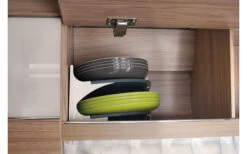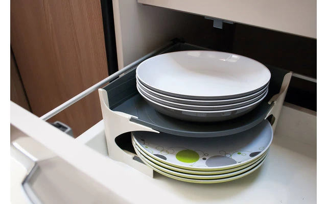 Teller-Eckablage für einen sicheren und geräuschlosen Transport Funktionales und sicheres Transportieren von Tellern während der Reise. Der Tellerhalter EKKOO verhindert, dass das Geschirr klappert und durch die Fahrtvibrationen verkratzt wird. Durch das praktische Design kann der Tellerhalter platzsparend in der Ecke verstaut werden.
